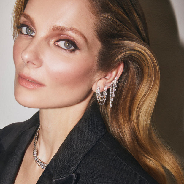 18k gold Bianca double loop earring with pear diamond studs.48cts pear diamonds1.12cts round diamondsPlease note that the earring requires two piercings.